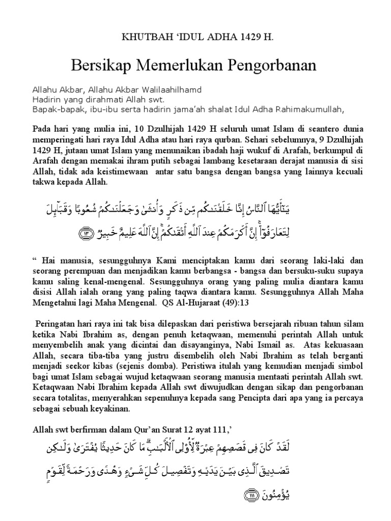 Sesuai dengan namanya, yaitu hari raya kurban, maka pada 10 dzulhijjah sampai dengan 3 hari berikutnya yang disebut sebagai hari tasyriq, marilah kita mendekatkan diri kepada allah dengan jalan. Totalitas berislam selayak keluarga ibrahim materi khutbah idul adha: Hari raya idul adha jatuh pada tanggal 10 bulan dzulhijjah, hari ini jatuh persis 70 hari setelah perayaan idul fitri. Berdasarkan pada hadits riwayat ahmad no. Materi khutbah idul adha :