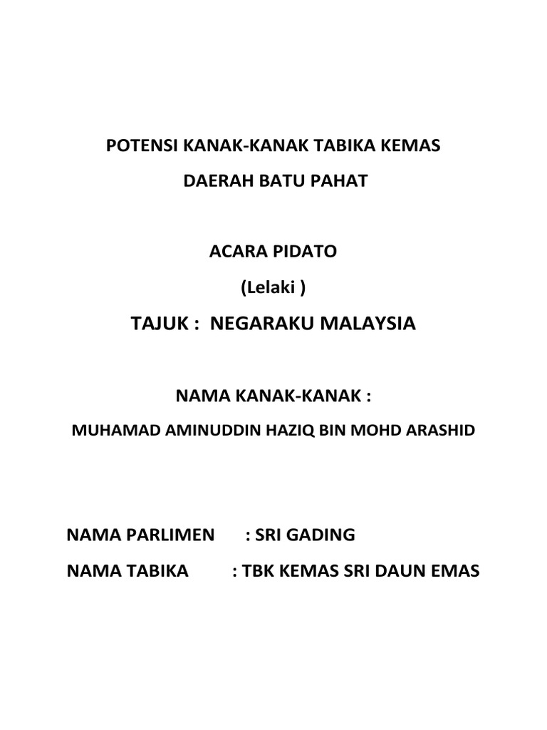 Teks Pidato Islam Tadika : Ayah dan ibu merupakan sosok pahlawan yang harus kita hormati dan patuhi segala perintahnya.. Alhamdulilahi rabbil 'alamin, was sholatu wassalamu 'ala, asyrofil ambiyaa iwal mursalin, sayyidina wa maulana muhammadin, wa 'alaa 'alihi wa shohbihi ajmain. Gelagatnya yang lincah selalu membuat pendengar terkesima. Bijak dalam menggunakan plastik adalah langkah sederhana untuk menyelamatkan bumi kita ini. Contoh teks pidato singkat tingkatkan empati dalam hidup bermasyarakat. Ketiga struktur tersebut merupakan komponen penting yang harus ada dalm sebuah teks pidato.